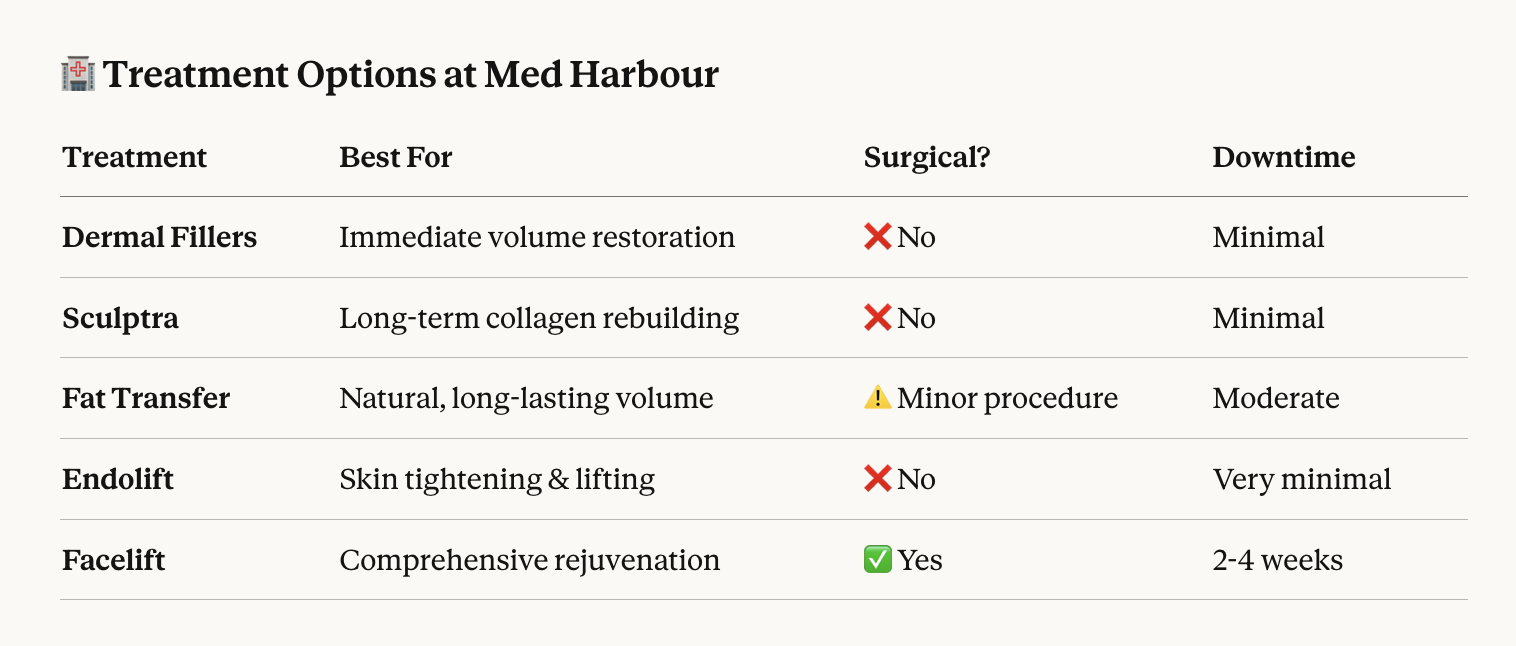 - Early preventative treatments — Starting fillers or Sculptra early can stay ahead of volume loss