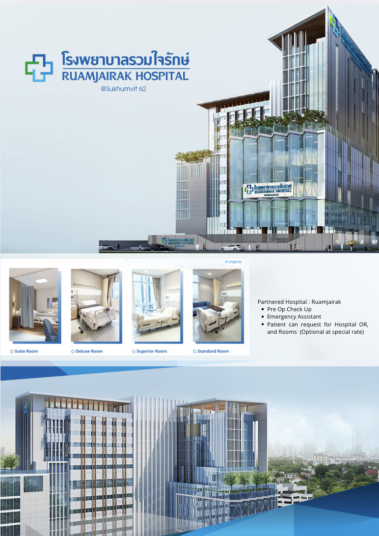 2) Another option is at Private hospital. In case the client wants the operaiton to be at the hospital , it is also possible. (There might be some additional cost for the special request depending on the number of operation, the date, the time, etc.). Normally the customer might be requested to pay additional of $5,000.00 per one operation / with 3 nights stay at hospital. (The hopsital is RUAMJAIRAK PRIVAT HOSPITAL, at Sukhumvit Road, Bangkok, Thailand)